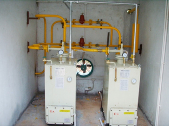 电热式汽化器的数量两台,是一备一用的,所以左边的那一台用来备用的,它的进出口需要关闭,用的时候需要先打开进口然后加热,温度40度左右然后再慢慢打开出口。它的汽化量为100KG/H,它的功能是将瓶组间的液态的液化气变成气态的气体!它的上面从右到左有一个安全放散阀与镀锌管连接排到外界;压力表显示汽化器中的压力,一般压力在0-7KG;有一个排污口,它是当汽化器中有很多的杂质的时候把它排到外面去,一般半年一次!在外表面有一个玻璃管,那是显示汽化器中的水位的水位管;中间是一个铭牌和安全说明书;右侧面是一个温度计,是显示汽化器中的水的温度!